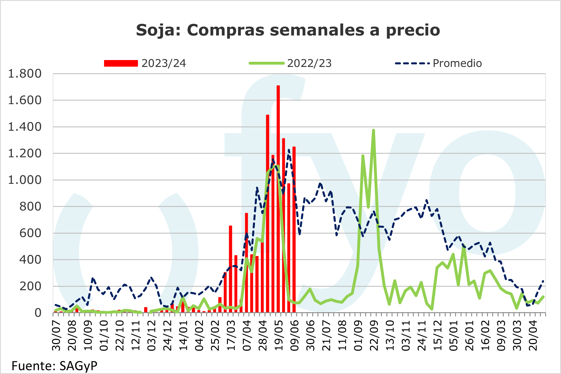 Para la semana finalizada el 14 de agosto, la originación de soja 23/24 cayó significativamente respecto de la semana precedente al ubicarse en 229.800 toneladas, cayendo de las 835.000 toneladas de la semana precedente. Por su parte, el volumen de pricing por parte del sector exportador de maíz disminuyo desde las 932.100 toneladas a 755.000 toneladas, por encima del promedio semanal. El trigo mostro un pricing de 74.000 toneladas, significativamente superior a las 9.000 toneladas de la semana precedente, pero muy por debajo del promedio para la fecha debido a que los vigentes bajos precios internacionales acarrean márgenes negativos para los compradores.