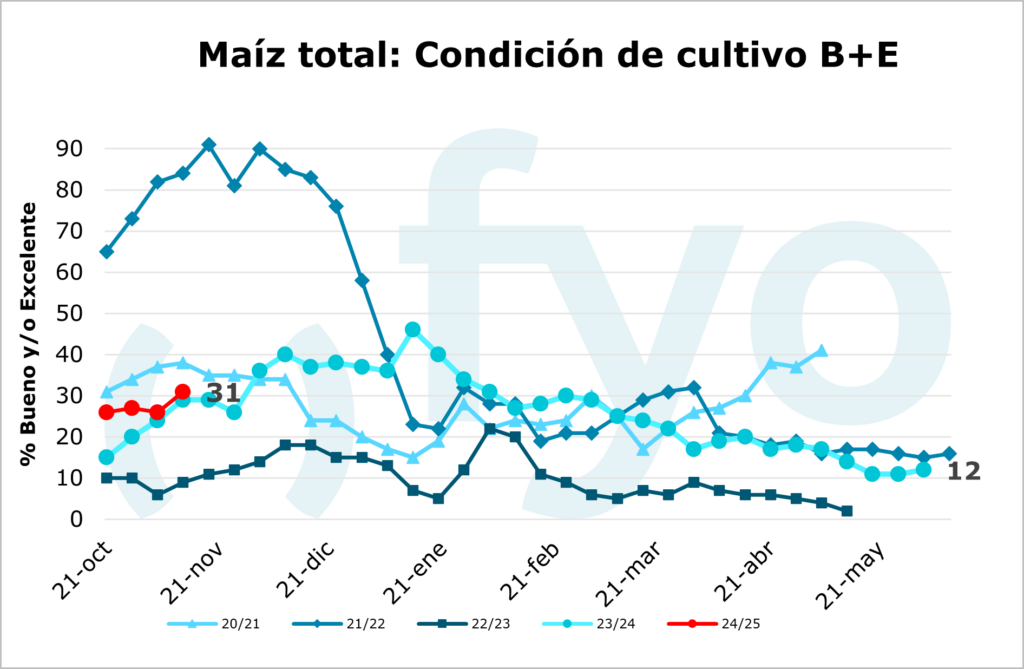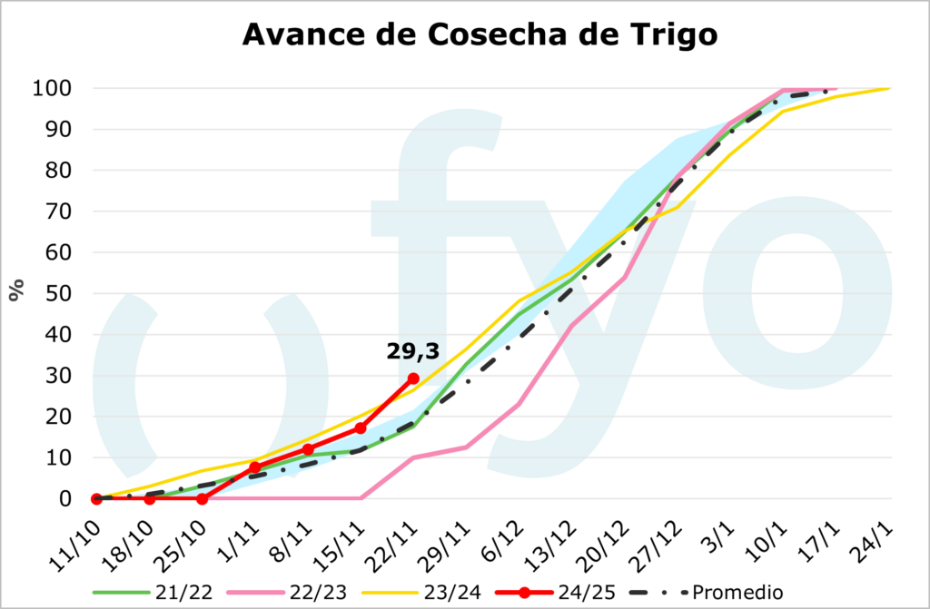 - La cosecha avanzó 12,1 pp. hasta el 29,3% del área (+3,3 pp. i.a.)