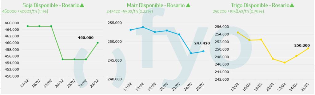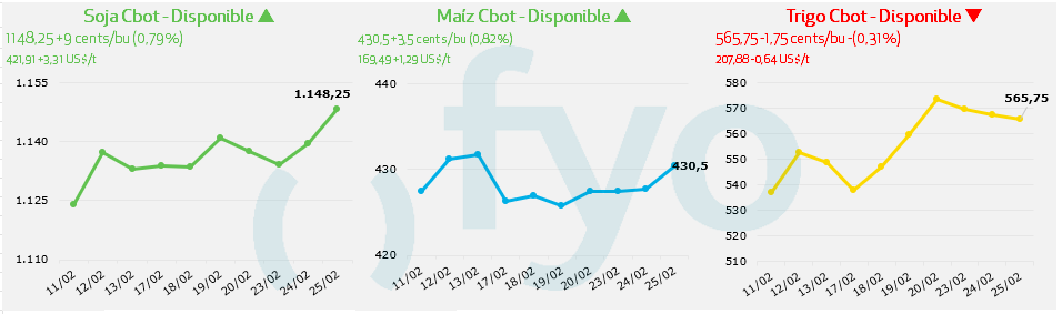 - El paro portuario estipulado para los días 26 y 27 de febrero genera incertidumbre respecto a la provisión por parte de Argentina de harina de soja, razón que se relaciona con las subas de cerca de 8 dólares durante la jornada.