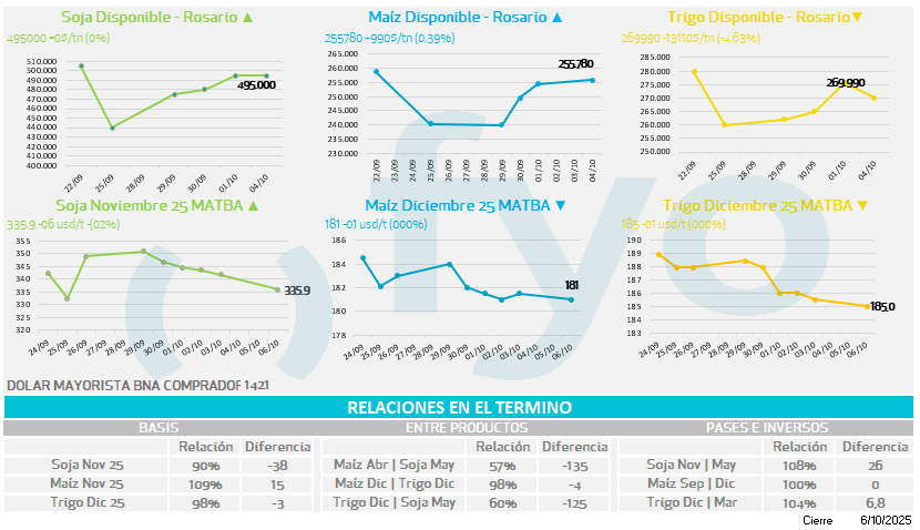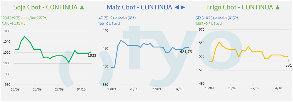 - Los precios del petróleo crudo suben después de que la OPEP+ anunciara un aumento de producción en noviembre inferior a lo esperada por el mercado, lo que, sumado a una posible reducción en los inventarios de aceite de palma de Malasia durante septiembre, aportan sostén a las subas de aceite de soja.