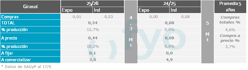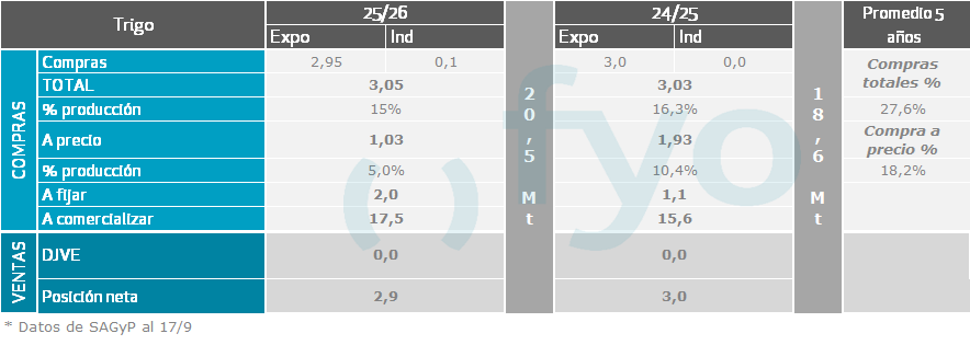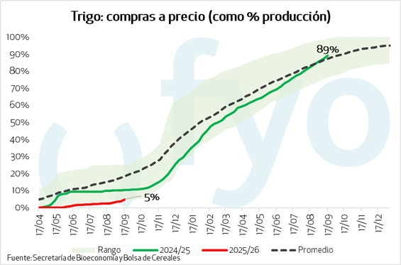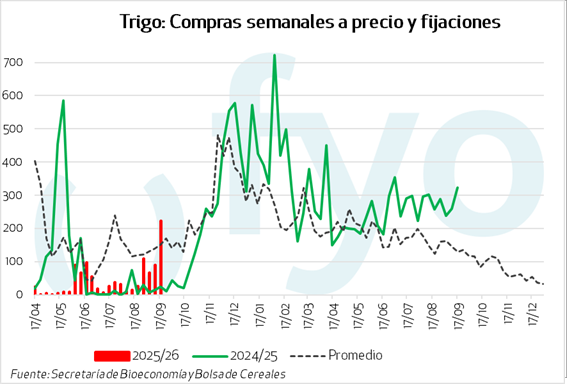 SAGyP publicó las compras en Argentina en la semana finalizada al 17 de septiembre. Las compras de trigo de la nueva campaña mostraron una aceleración, y se le pusieron precio a 223.000 tt. del cereal. De todas formas, los negocios con precios alcanzaron al 5% de la producción.