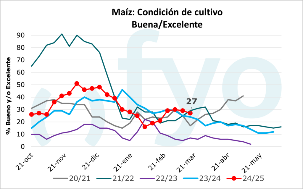 Rendimiento promedio se ubica en 83,9 qq/Ha, destacándose la zona Núcleo Norte con un promedio de 96,4 qq/Ha. - Maíz tardío cursando buena humedad, exceptuando los cultivos del norte donde las lluvias recientes no tendrían un impacto significativo en la condición de los cultivos en esa región.