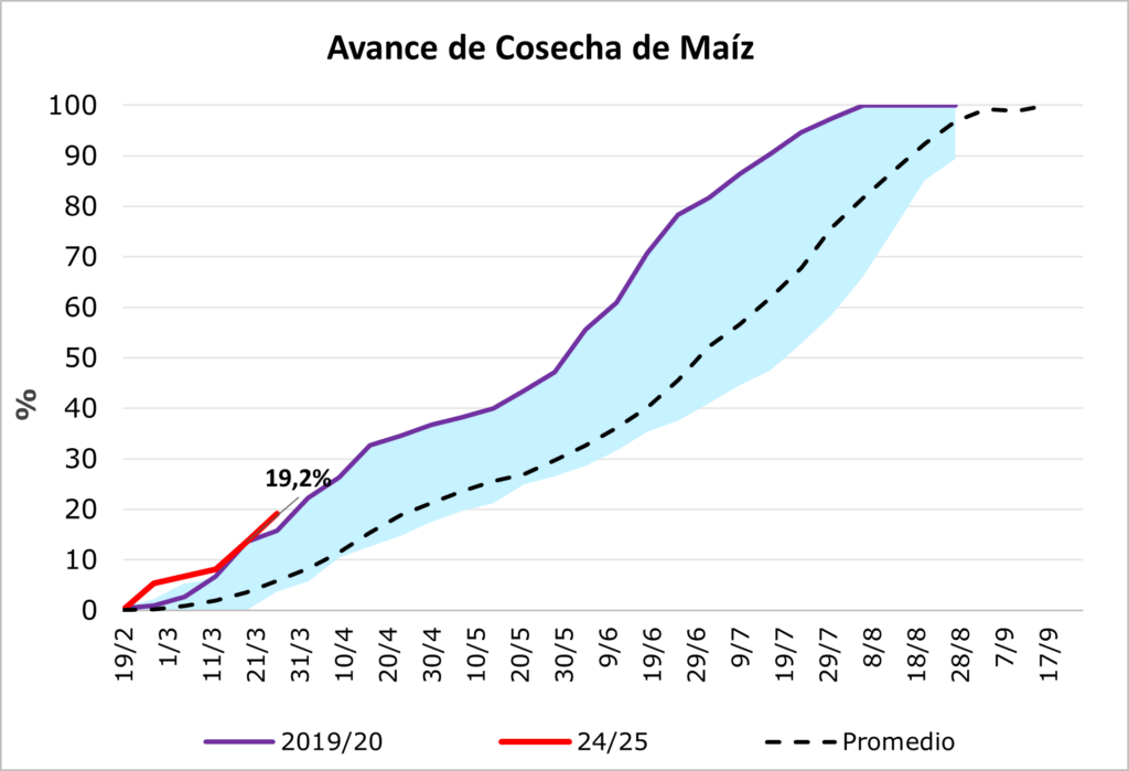 - Cosecha avanza al 19,2%, lo que significa un adelanto interanual de 13,2 p.p. dada la mayor proporción de siembra temprana sumado a que algunos planteos finalizaron su ciclo de manera anticipada debido al estrés hídrico sufrido durante el llenado de granos.