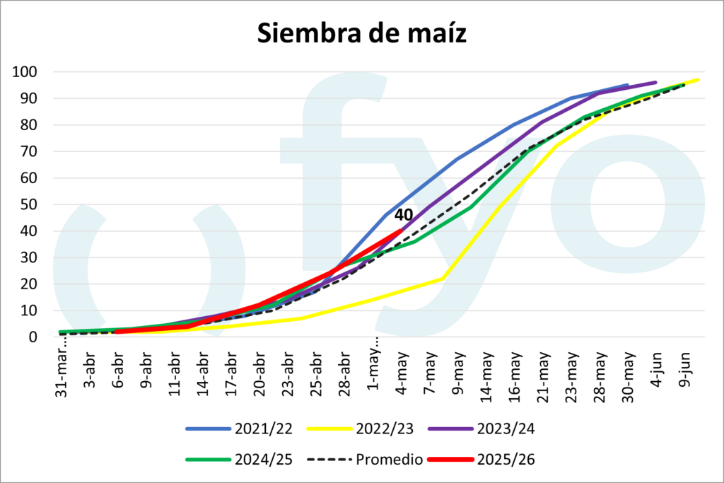 La siembra de maíz avanzó 16 puntos porcentuales, alcanzando el 40 % del área estimada, por encima del promedio del 39 %.