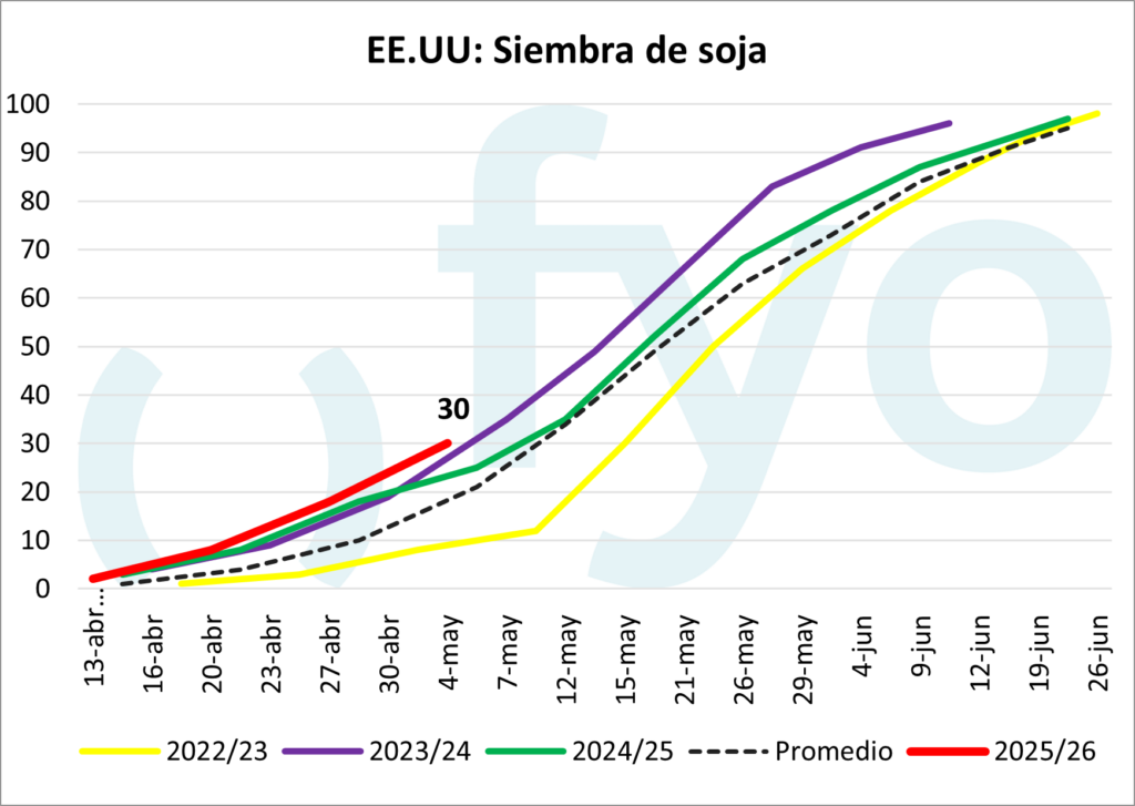 La siembra de soja alcanzó el 30 %, un punto por debajo de lo previsto. A su vez, este dato se ubica por encima del promedio de los últimos cinco años (23 %).