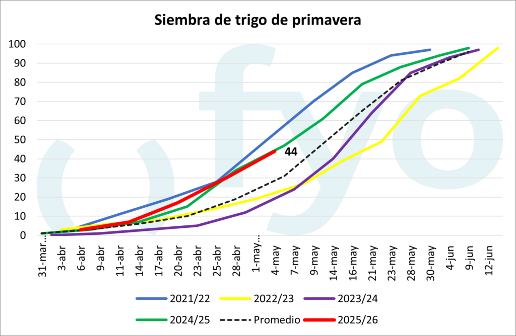 Por su parte, la siembra de trigo de primavera avanzó hasta el 44 %, por encima del promedio (34 %).
