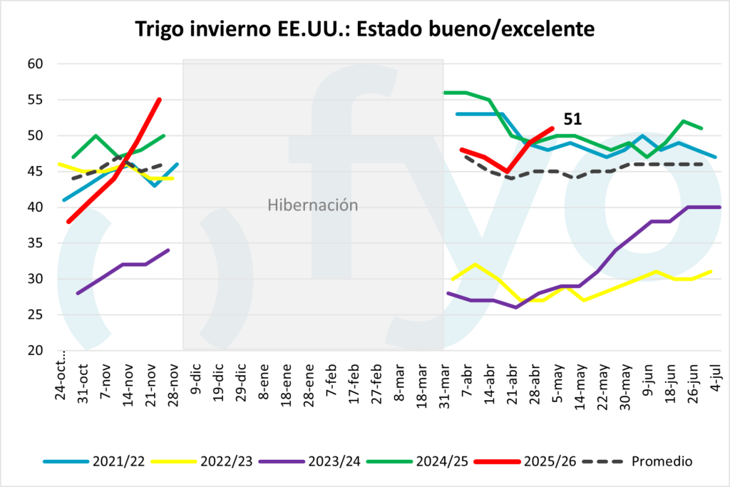 El trigo de invierno se encuentra en condición buena/excelente en el 51 % del área, lo que representa una mejora de 2 puntos porcentuales y supera las expectativas del 50 %.