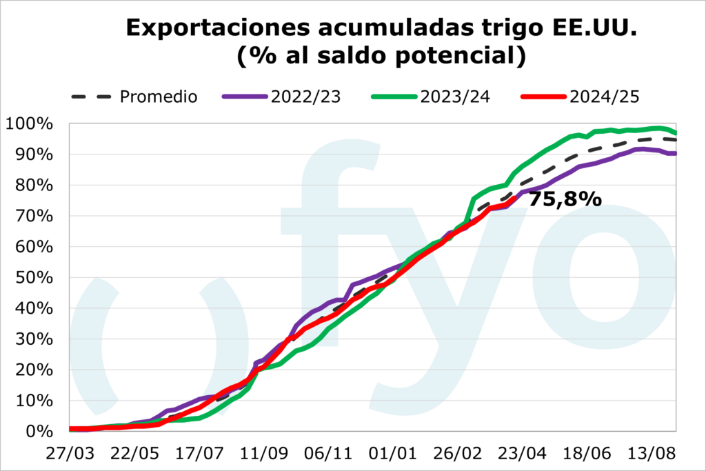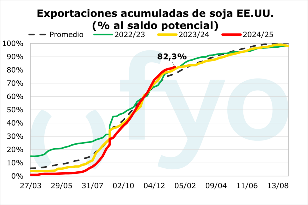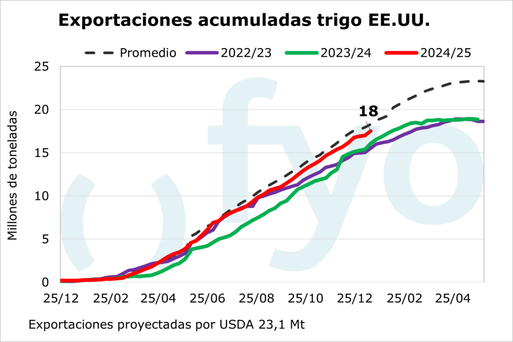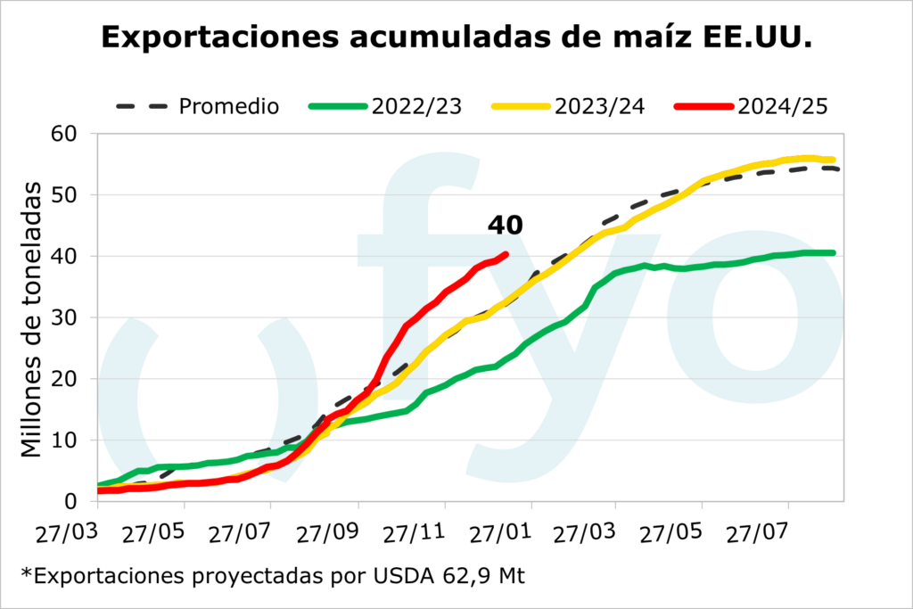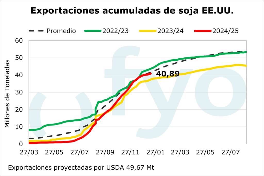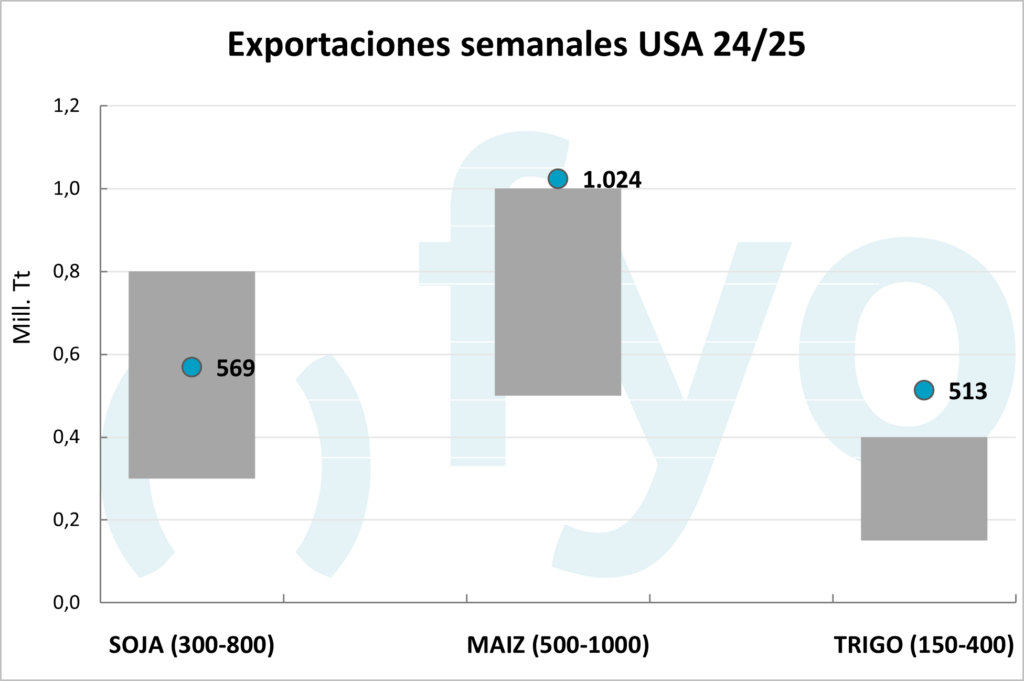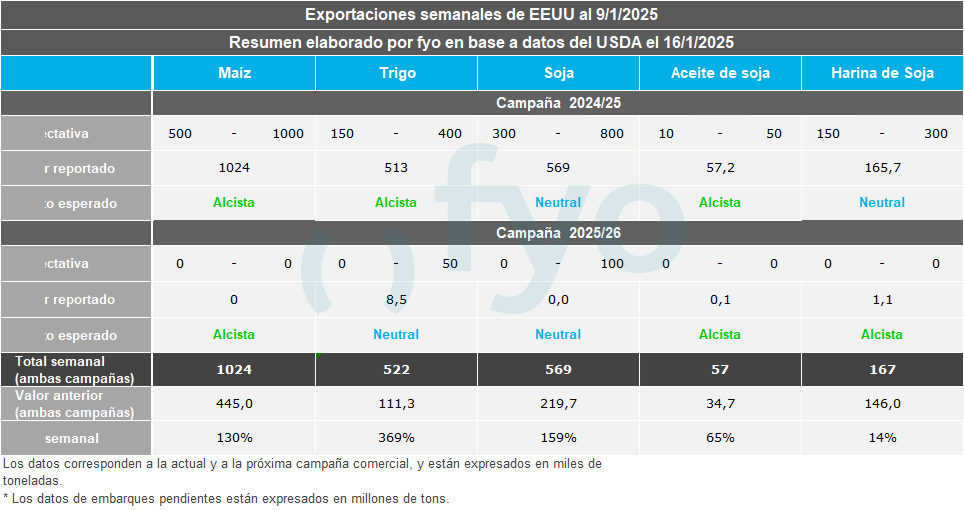 El USDA informó sobre las ventas norteamericanas de exportación hasta el 9 de enero. Las ventas netas de poroto de soja fueron de 569.000 toneladas, dentro de lo esperado por el mercado. En cuanto al maíz, el volumen de ventas fue de un millón de toneladas, un valor similar al promedio de los cuatro informes anteriores, pero ligeramente por encima de las expectativas comerciales. Respecto al trigo, las ventas netas fueron de 513.000 toneladas, a un ritmo superior al esperado y al promedio de las últimas semanas (+55%).