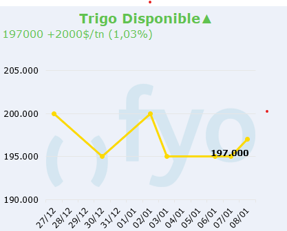 - Por trigo con entrega en Rosario, la exportación arrancó al igual que ayer en $ 195.000, para ir luego hasta $ 197.000 con descarga inmediata. Un comprador pagó algo por encima de este valor, pero en combo con entrega en Bahía Blanca.