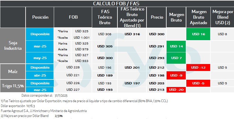 En el caso de la posición fábrica se parte de los precios FOB de los subproductos, luego se les aplica al valor del aceite, el porcentaje de rendimiento del poroto de soja para la extracción del mismo, y lo mismo en harina. Se suman estos valores, y se descuenta el costo de molienda estimado. El resultante es la capacidad teórica de la fábrica.
