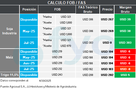 En el caso de la posición fábrica se parte de los precios FOB de los subproductos, luego se les aplica al valor del aceite, el porcentaje de rendimiento del poroto de soja para la extracción del mismo, y lo mismo en harina. Se suman estos valores, y se descuenta el costo de molienda estimado. El resultante es la capacidad teórica de la fábrica.