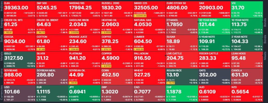 - El nuevo esquema arancelario de EE.UU. continúa haciendo caer las acciones estadounidenses y los precios del petróleo, ya que los inversores temían una recesión mundial, mientras que los operadores de granos veían margen para una interrupción de las exportaciones agrícolas de Estados Unidos, en particular los envíos de soja a China.