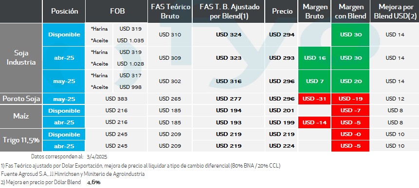 En el caso de la posición fábrica se parte de los precios FOB de los subproductos, luego se les aplica al valor del aceite, el porcentaje de rendimiento del poroto de soja para la extracción del mismo, y lo mismo en harina. Se suman estos valores, y se descuenta el costo de molienda estimado. El resultante es la capacidad teórica de la fábrica.