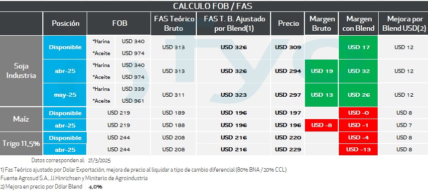 En el caso de la posición fábrica se parte de los precios FOB de los subproductos, luego se les aplica al valor del aceite, el porcentaje de rendimiento del poroto de soja para la extracción del mismo, y lo mismo en harina. Se suman estos valores, y se descuenta el costo de molienda estimado. El resultante es la capacidad teórica de la fábrica.