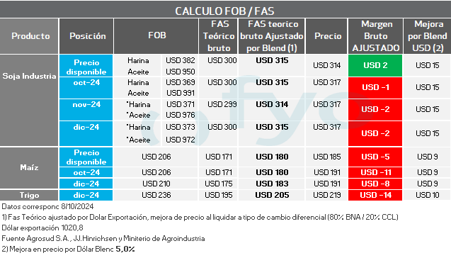 En el caso de la posición fábrica se parte de los precios FOB de los subproductos, luego se les aplica al valor del aceite, el porcentaje de rendimiento del poroto de soja para la extracción del mismo, y lo mismo en harina. Se suman estos valores, y se descuenta el costo de molienda estimado. El resultante es la capacidad teórica de la fábrica.