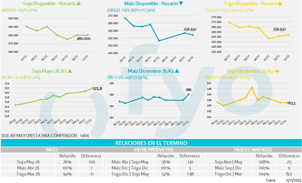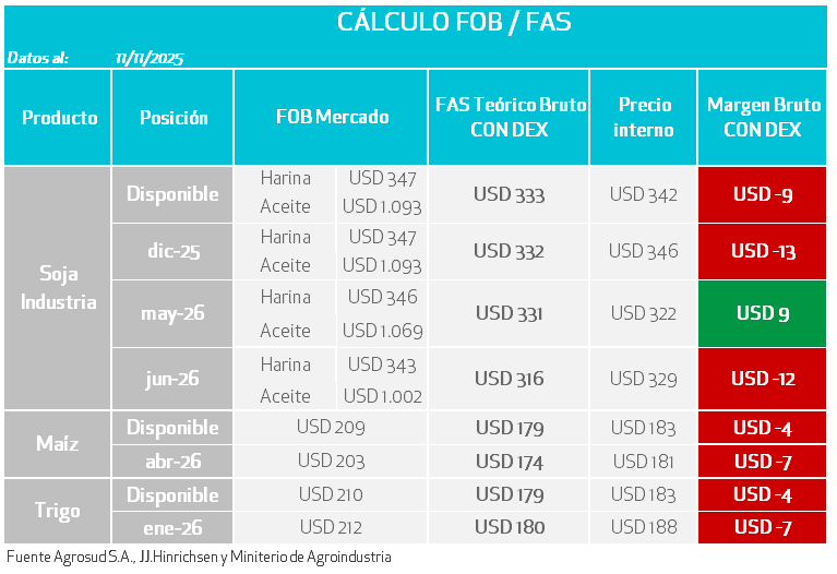 - Las existencias en los puertos chinos se ubican en 10,3 Mt el 7 de noviembre, por encima de las 7,5 Mt del año pasado. Esta sobreoferta, junto con los débiles márgenes de molienda, limita el apetito de Pekín por nuevas compras.