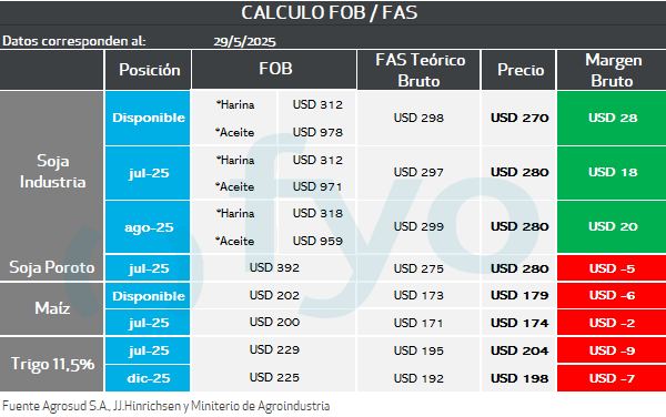 En el caso de la posición fábrica se parte de los precios FOB de los subproductos, luego se les aplica al valor del aceite, el porcentaje de rendimiento del poroto de soja para la extracción del mismo, y lo mismo en harina. Se suman estos valores, y se descuenta el costo de molienda estimado. El resultante es la capacidad teórica de la fábrica.