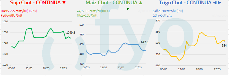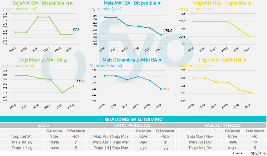 Granos maíz, trigo, soja, harina de soja, aceite de soja, cebada, arroz, trigo y canola.