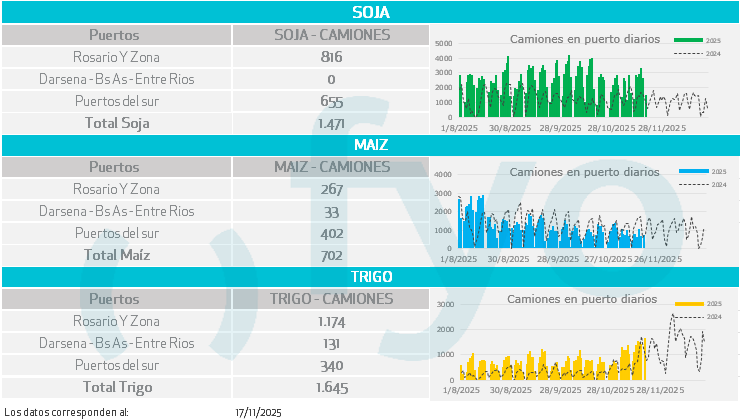 - La consultora Sovecon estimó exportaciones de granos de Rusia (trigo, cebada y maíz) para noviembre en 5,0 Mt, 0,4 Mt debajo de octubre.