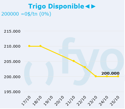 - Por trigo disponible puesto en Rosario se pagaron $ 200.000. Para entregas a cosecha, se podían trabajar ofertas en USD 205 para entrega noviembre/diciembre.