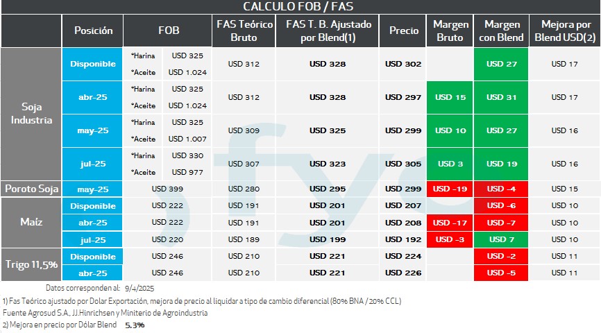 En el caso de la posición fábrica se parte de los precios FOB de los subproductos, luego se les aplica al valor del aceite, el porcentaje de rendimiento del poroto de soja para la extracción del mismo, y lo mismo en harina. Se suman estos valores, y se descuenta el costo de molienda estimado. El resultante es la capacidad teórica de la fábrica.