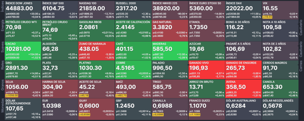 Energía petrólo WTI, gas oil con ultra bajo contenido de azufe (ULSD), nafta, gas natural, petróleo Brent y etanol.