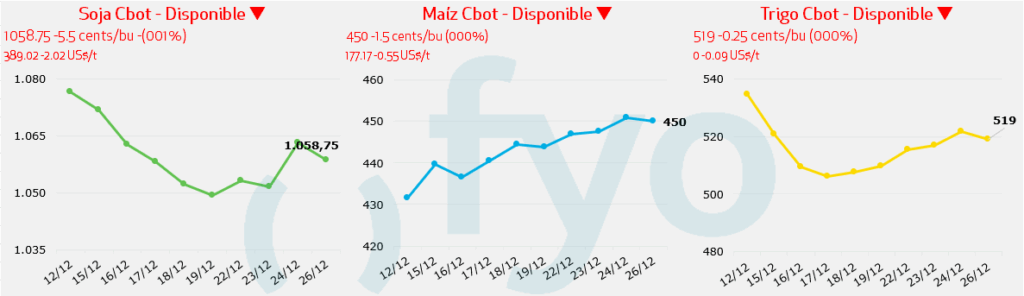 - El mercado mantiene cautela ante el ritmo de las compras de China en Estados Unidos, sin notificaciones de nuevas ventas el día de hoy. El reporte de exportaciones semanales del USDA indicó que las ventas netas de soja estadounidense a China para la campaña 2025/26 alcanzaron 1,38 Mt en la semana terminada el 11 de diciembre, acumulando un total de 5,41 Mt, cifra que se sitúa en el nivel más bajo de los últimos 14 años para este periodo.