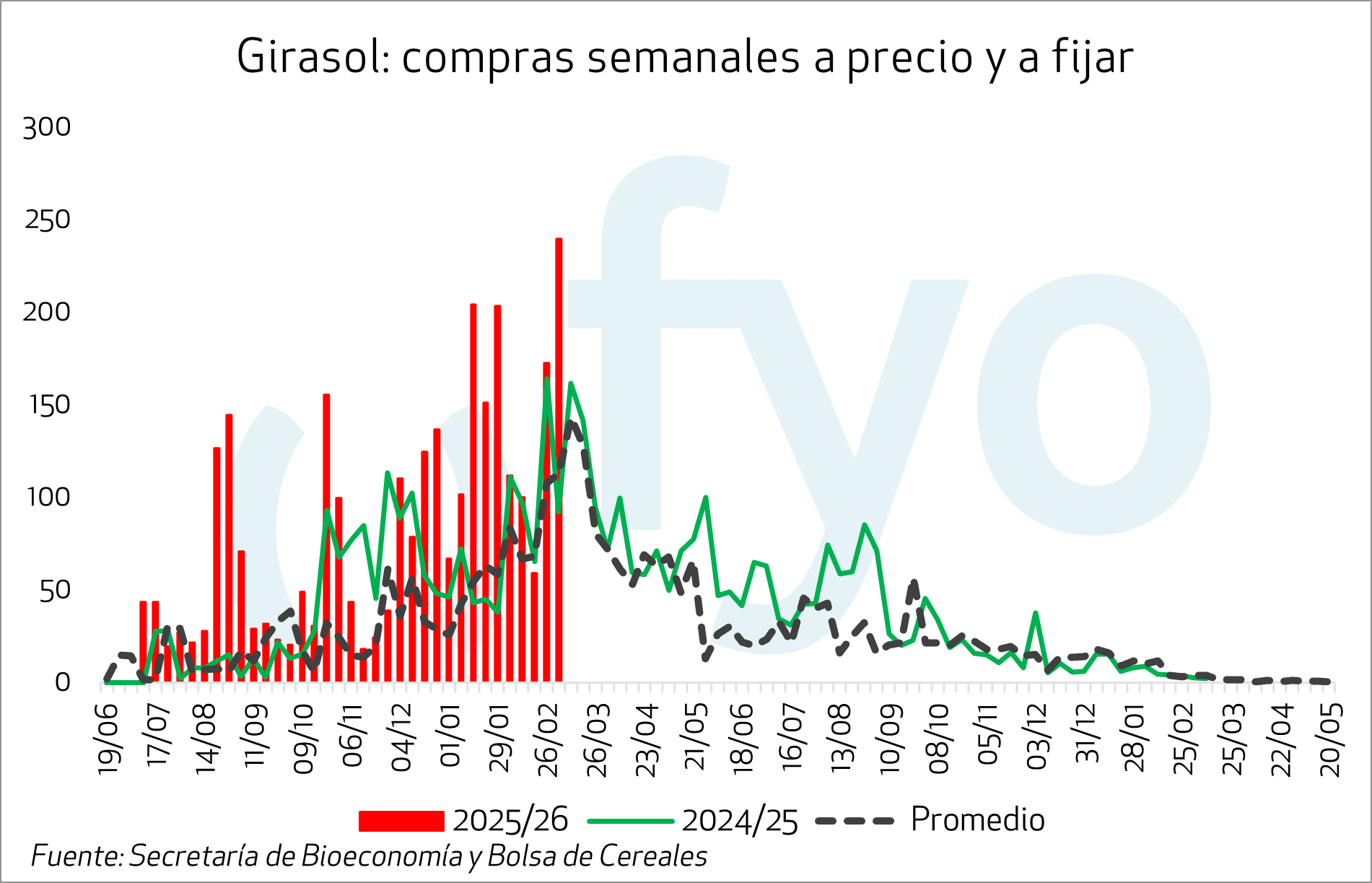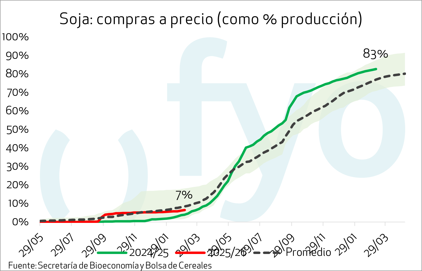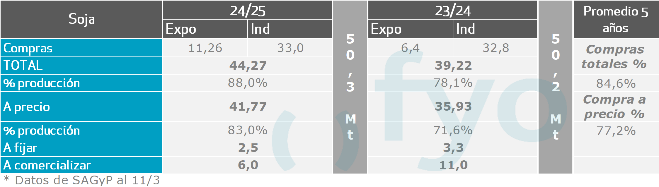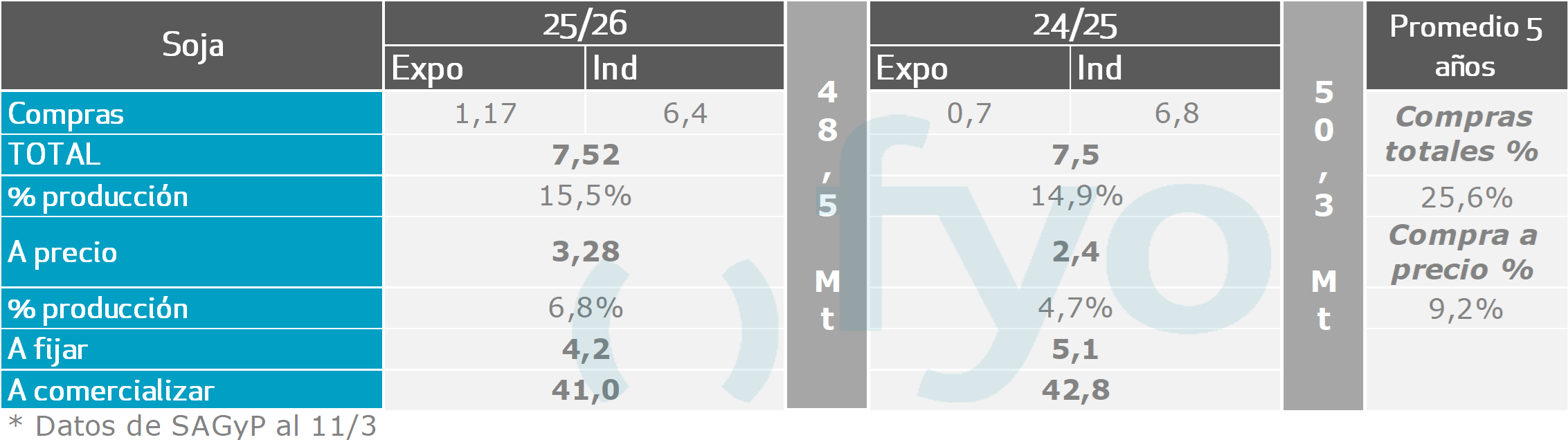 Los negocios de soja a cosecha cuentan con 1 Mt vendidas a fijar en la semana de referencia, alcanzando 4,2 Mt en tal condición, lo que equivale al 9% de una producción esperada de 48,5 Mt.