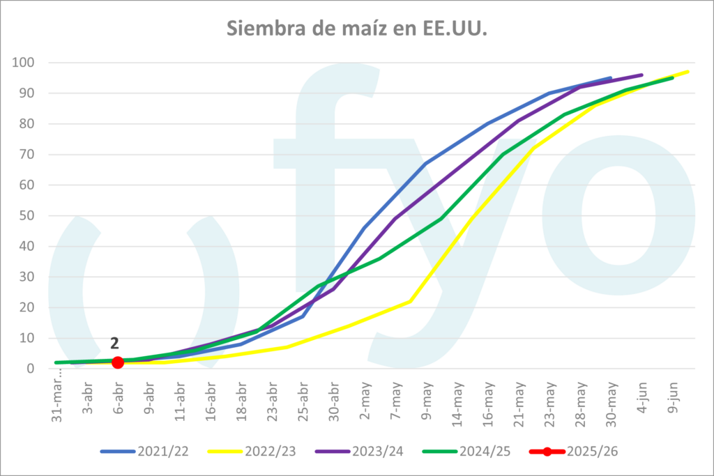 El USDA informó ayer que las labores de siembra de maíz cubren un 3% del área apta. Este dato está en línea con las expectativas y el promedio de las últimas cinco campañas norteamericanas. Además, fue apenas inferior al ritmo de siembra del año pasado en la misma fecha.