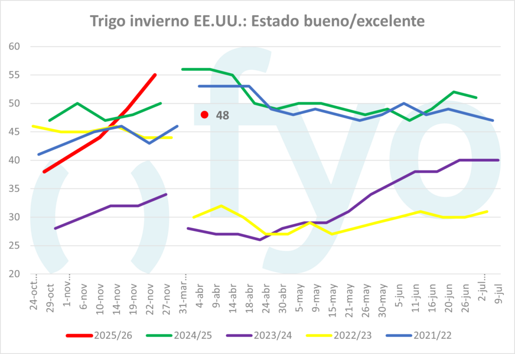 Luego del período de hibernación, el trigo de invierno en condiciones buenas y excelentes alcanza el 48% del área sembrada. Este dato fue menor al 55% registrado al comenzar la hibernación. Aún así, fue un punto porcentual mejor de lo esperado.