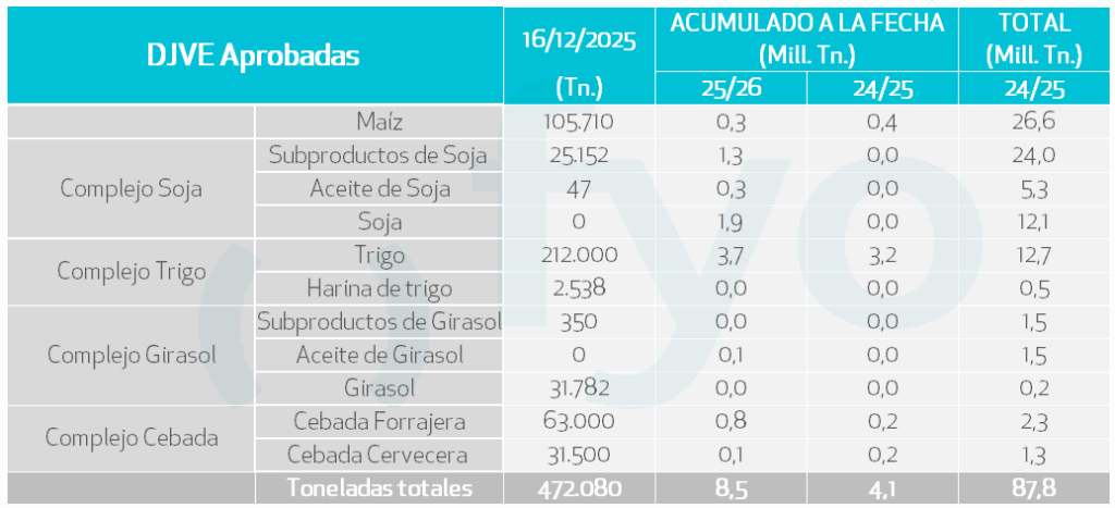 - Las importaciones de la Unión Europea 25/26 alcanzaron los 5,65 millones de toneladas (Mt) al 14 de diciembre, una caída del 13% respecto al mismo período del año anterior.