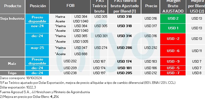 En el caso de la posición fábrica se parte de los precios FOB de los subproductos, luego se les aplica al valor del aceite, el porcentaje de rendimiento del poroto de soja para la extracción del mismo, y lo mismo en harina. Se suman estos valores, y se descuenta el costo de molienda estimado. El resultante es la capacidad teórica de la fábrica.