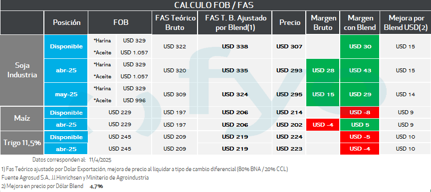En el caso de la posición fábrica se parte de los precios FOB de los subproductos, luego se les aplica al valor del aceite, el porcentaje de rendimiento del poroto de soja para la extracción del mismo, y lo mismo en harina. Se suman estos valores, y se descuenta el costo de molienda estimado. El resultante es la capacidad teórica de la fábrica.