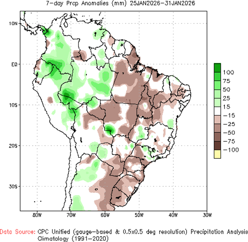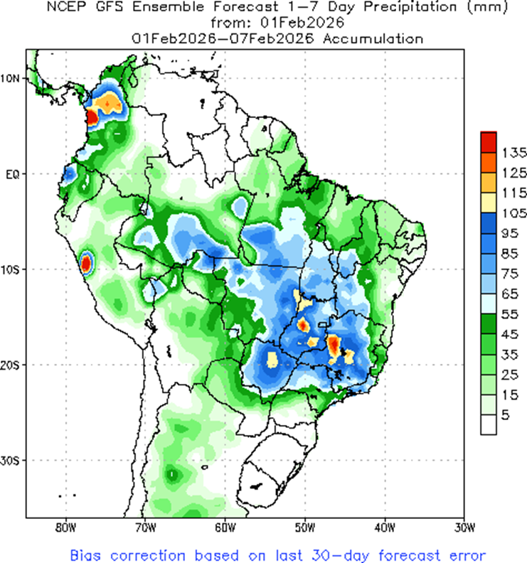 - India enfrentará un febrero más cálido y seco, con lluvias en las regiones productoras del noroeste que probablemente serán inferiores al 78% del promedio histórico. Esto pone en riesgo los rendimientos de una superficie sembrada récord de 33,42 millones de hectáreas (MHa) de trigo.