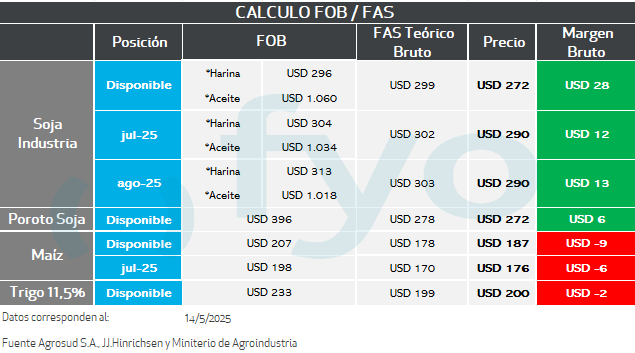 En el caso de la posición fábrica se parte de los precios FOB de los subproductos, luego se les aplica al valor del aceite, el porcentaje de rendimiento del poroto de soja para la extracción del mismo, y lo mismo en harina. Se suman estos valores, y se descuenta el costo de molienda estimado. El resultante es la capacidad teórica de la fábrica.