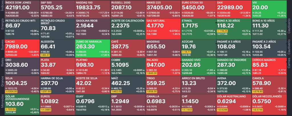 financieros bonos del tesoro de EEUU, bonos eurodollar, y tasas de la reserva federal de EEUU. Monedas índice dólar, libra, dólar canadiense, yen japonés, franco suizo,euro, dólar australiano, peso mejicano, dólar de Nueva Zelanda, rand de Sudáfrica y Rublo ruso.