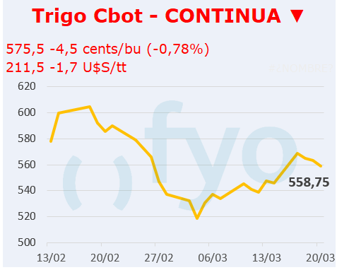 • La fortaleza del dólar norteamericano presiona a los futuros del trigo en Chicago, sumado a las últimas conversaciones en búsqueda de un alto al fuego en el Mar Negro, que buscan reducir las hostilidades de la guerra en la principal zona exportadora del cereal del mundo.