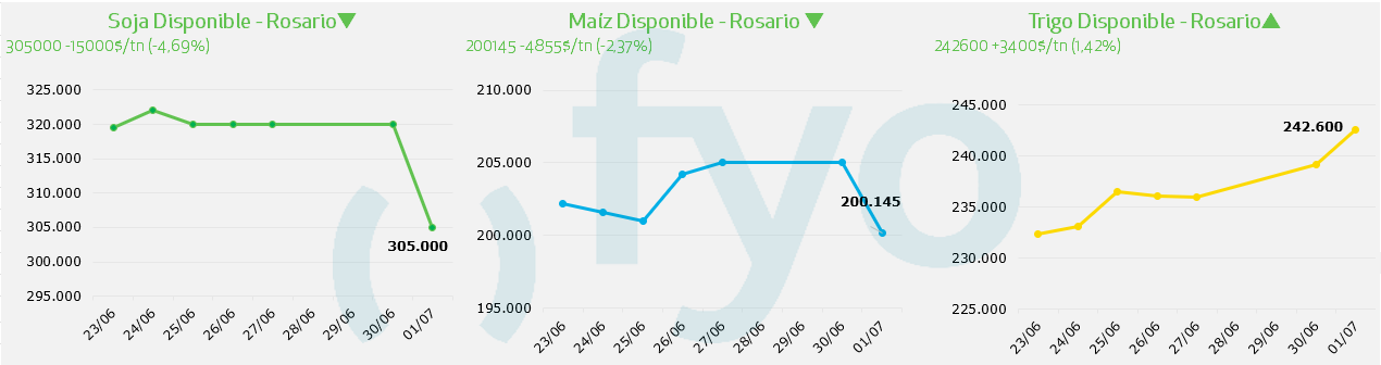 - Por maíz con entrega en Rosario entre el 15/7 y el 15/8, se pagaron $ 205.000, con Bahía Blanca para esa misma entrega en $ 210.000.