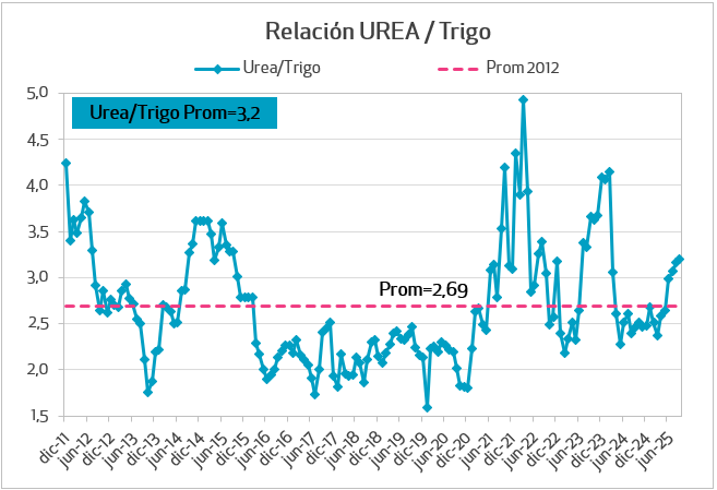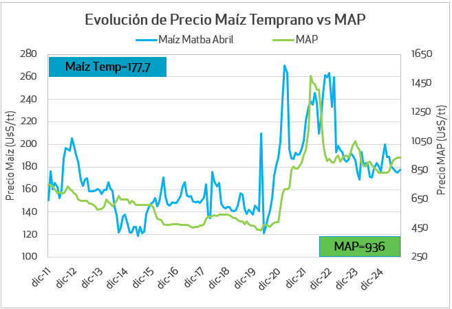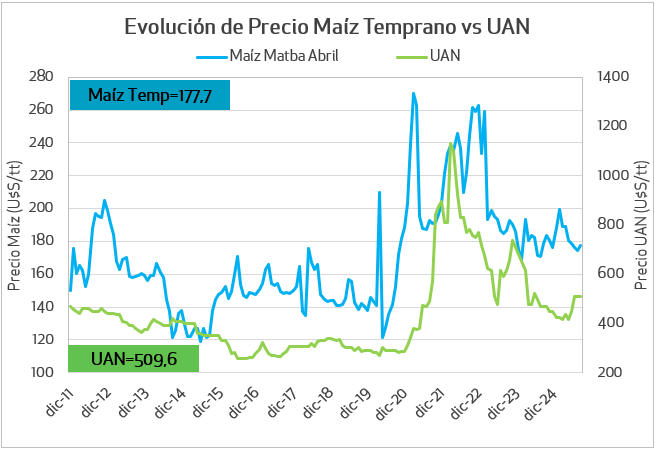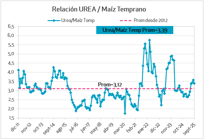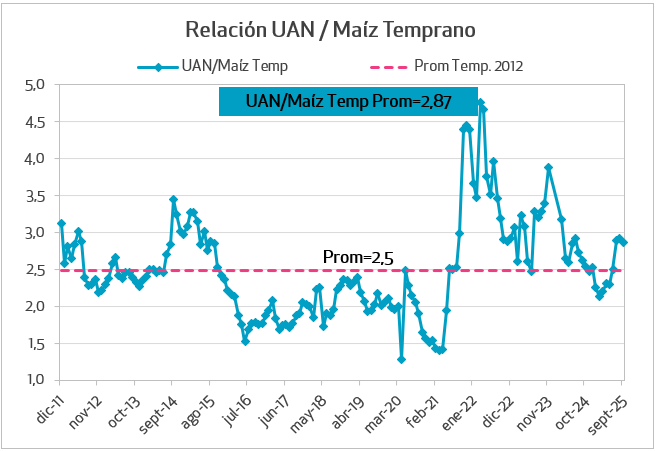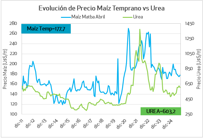Durante el último mes, las relaciones insumo-producto han mostrado un comportamiento dispar. En el caso particular del maíz temprano, la relación insumo-producto mejoró debido a un aumento en el precio del cereal en las últimas ruedas de cosecha, así como a la caída en los precios de la urea.
