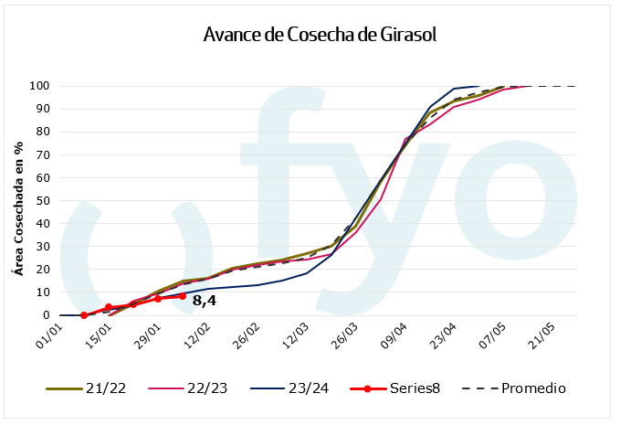 – La cosecha avanza al 8,4% de la superficie, con un rendimiento promedio hasta el momento de 21,4 qq/ha.