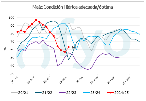 – La condición hídrica óptima/adecuada se incrementa 6 p.p., hasta el 63%.