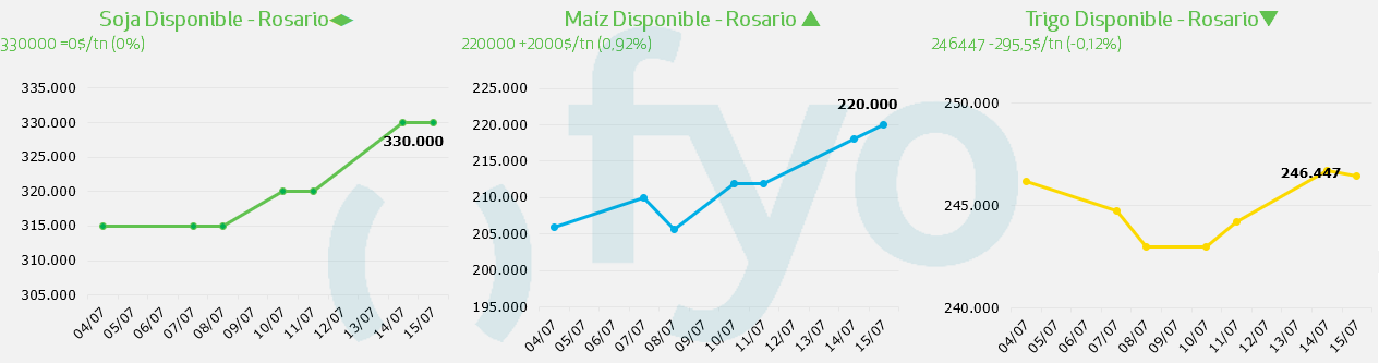 - Por trigo disponible en Rosario se pagaron USD 197. Continuaron los negocios entrega agosto con pago, esta vez, por $253.000.