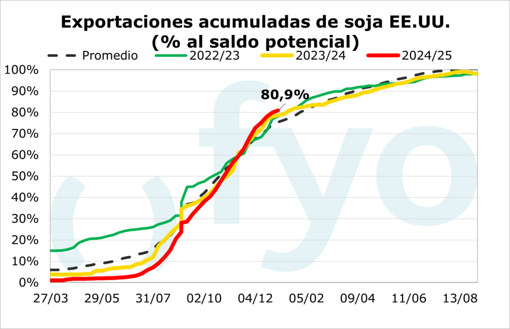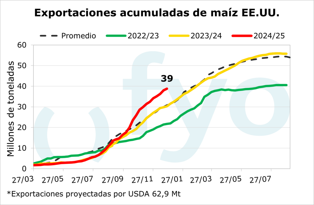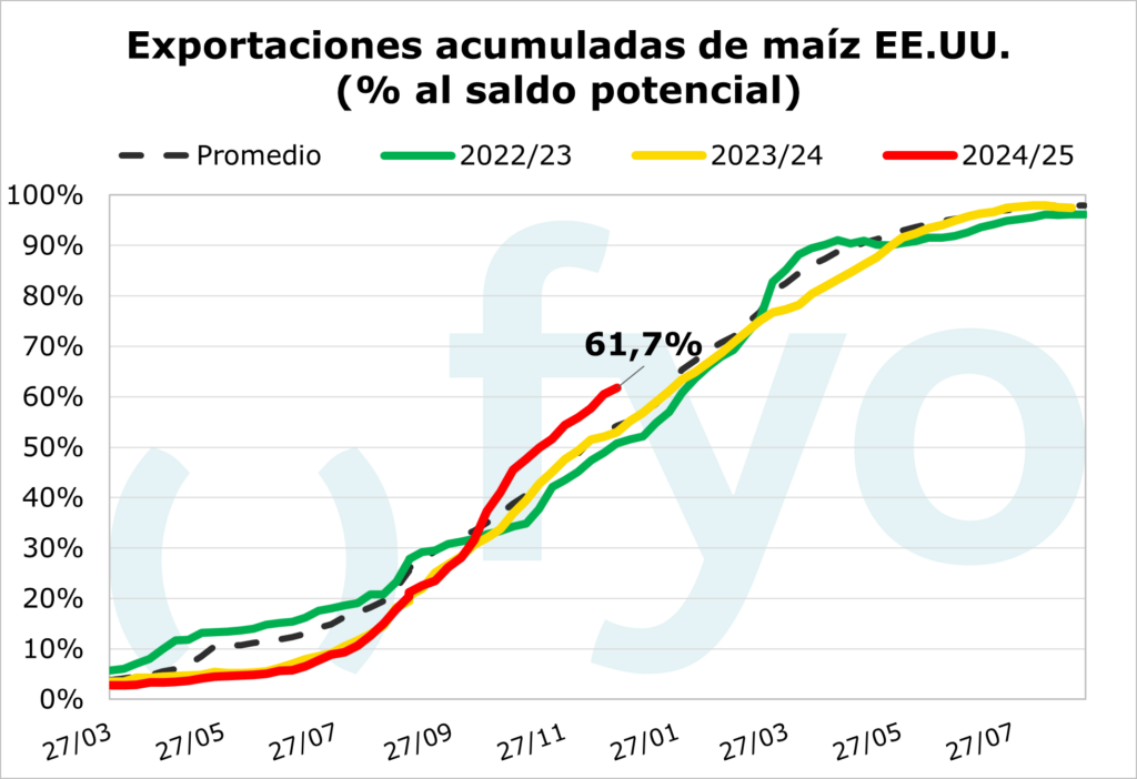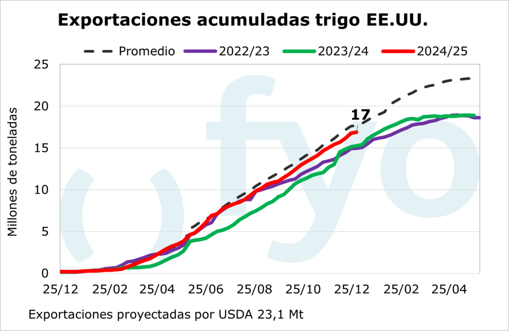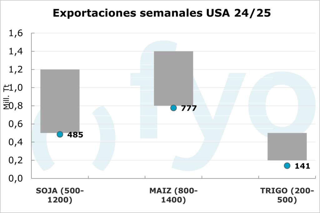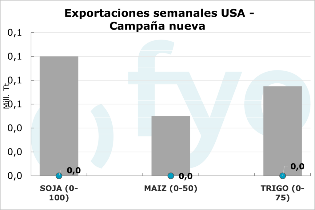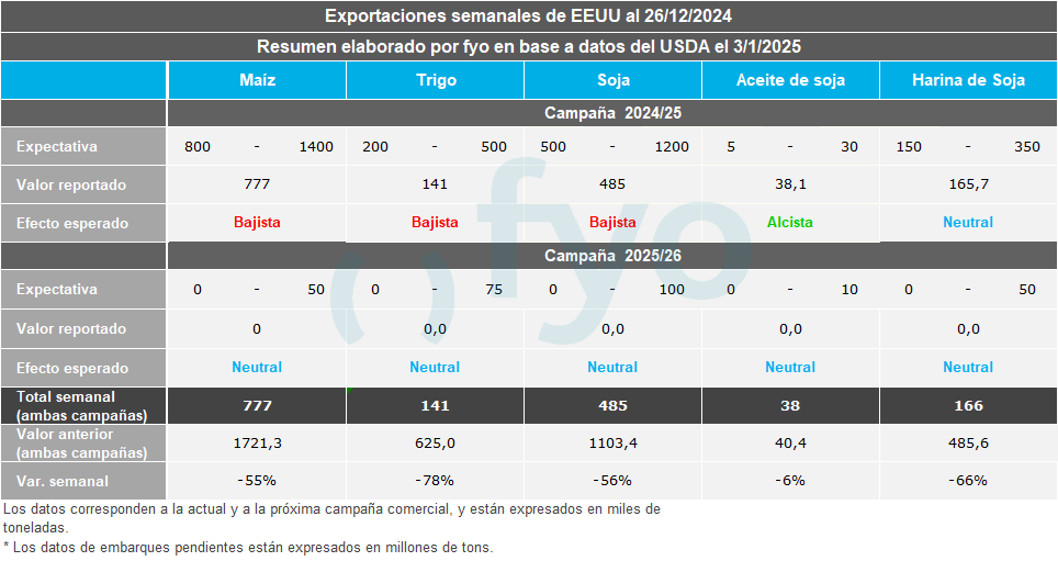 El USDA informó sobre las ventas norteamericanas a la exportación hasta el 26 de diciembre. Las ventas netas de poroto de soja fueron de 485.000 toneladas, el volumen más bajo de la campaña comercial, lo que representa un 67% menos que el promedio de las cuatro semanas anteriores. En cuanto al maíz, el volumen de ventas fue de 777.000 toneladas, y al igual que en soja, el volumen reportado fue un 44% inferior al promedio de los cuatro informes anteriores. Respecto al trigo, las ventas netas fueron de 140.000 toneladas, a un ritmo considerablemente inferior en comparación con las últimas semanas (-68%).