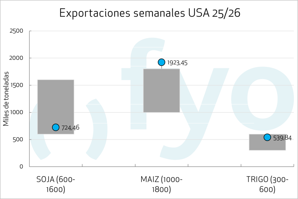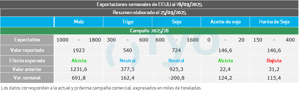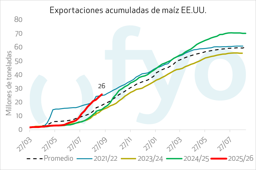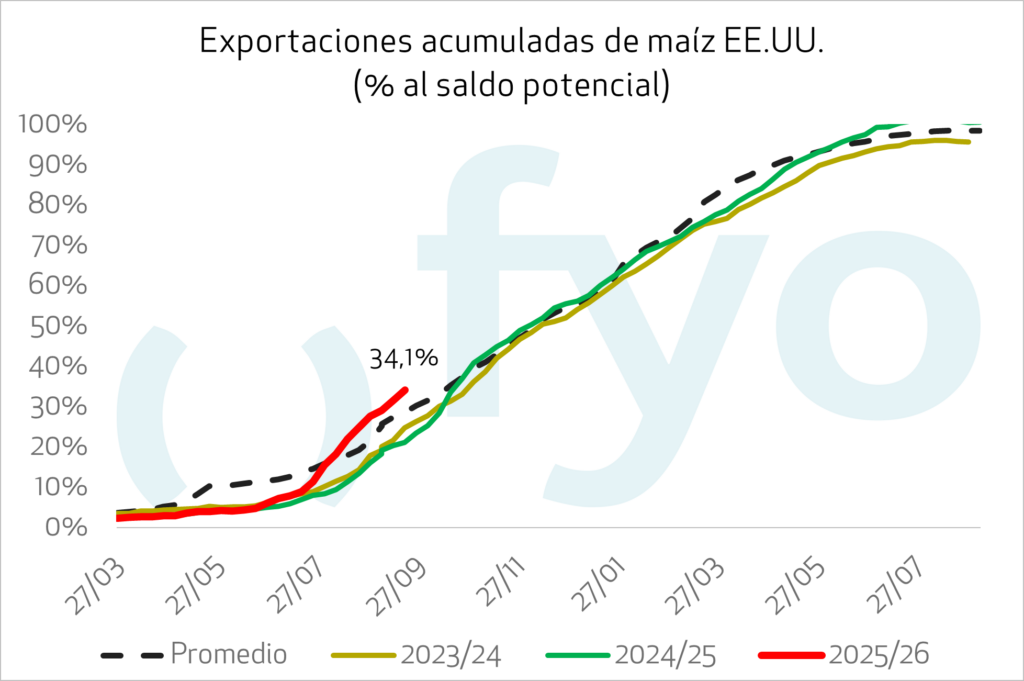 Las ventas de exportación de maíz estadounidense para la semana fueron de 1.923.000 toneladas, superando las expectativas del mercado que se situaban entre 1.000.000 y 1.800.000 toneladas. El ritmo de ventas en las primeras tres semanas del ciclo comercial promedia 1.231.900 toneladas semanales, en comparación con las 683.260 toneladas semanales del mismo período del año pasado. Los principales compradores fueron México (859.000 t), destinos desconocidos (502.000 t) y Colombia (190.000 t).