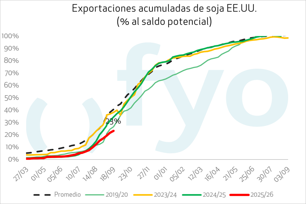 Las ventas semanales de exportación de soja de Estados Unidos se ubicaron en 725.000 toneladas, en el extremo inferior del rango esperado por el mercado de 600.000 a 1.600.000 toneladas. Los principales destinos de la semana fueron destinos desconocidos (230.000 t), Taiwán (116.000 t) y México (86.000 t). En subproductos, las ventas de harina de soja para la nueva campaña (147.000 t) se situaron en la parte baja de las expectativas, mientras que las de aceite de soja (53.200 t) superaron las previsiones.