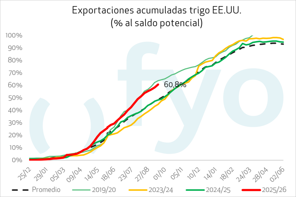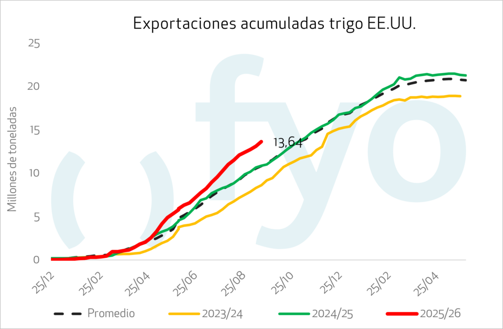 Se registraron ventas semanales de exportación de trigo por 540.000 toneladas, ubicándose en el extremo superior de las estimaciones del mercado (300.000-600.000 t) y marcando el mayor volumen en cuatro semanas. Los compromisos acumulados para la campaña 2025/26 totalizan 13,6 millones de toneladas, un 24% por encima de los 11,0 millones de toneladas del año pasado y el nivel más alto en nueve años para esta fecha. Los destinos más destacados de la semana fueron Filipinas (116.000 t), Indonesia (77.000 t) e Italia (62.000 t).