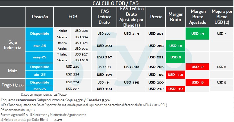 En el caso de la posición fábrica se parte de los precios FOB de los subproductos, luego se les aplica al valor del aceite, el porcentaje de rendimiento del poroto de soja para la extracción del mismo, y lo mismo en harina. Se suman estos valores, y se descuenta el costo de molienda estimado. El resultante es la capacidad teórica de la fábrica.