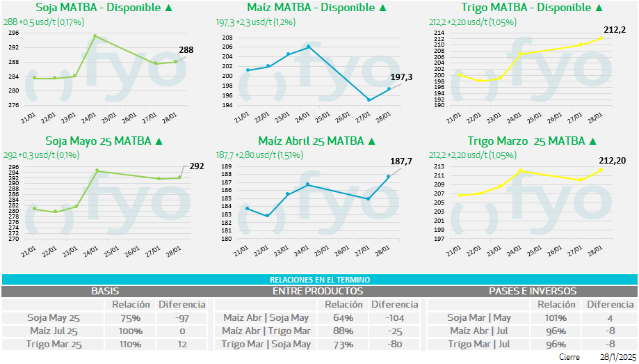 Granos maíz, trigo, soja, harina de soja, aceite de soja, cebada, arroz, trigo y canola.