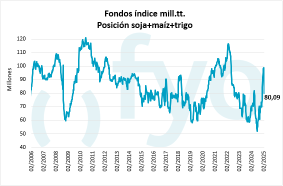 En el caso de la soja, se detuvo la racha vendedora de cinco semanas (que acumularon unas 10 Mt), registrándose en la última semana compras netas por el equivalente a 3,6 Mt en futuros y opciones. En cuanto al maíz, el comportamiento difiere al de la soja, mostrando ventas netas por tercera semana consecutiva (acumulando 20 Mt); de todas formas, la posición neta continúa siendo compradora por el equivalente a 6,7 millones de toneladas. Para el trigo, no hubo una variación significativa. Cabe mencionar, además, que los fondos que invierten en índices de commodities continuaron reduciendo su posición en soja, maíz y trigo por el equivalente a 5 Mt, de modo que el desarme de posición larga de las últimas tres semanas ha sido de 18,7 Mt.
