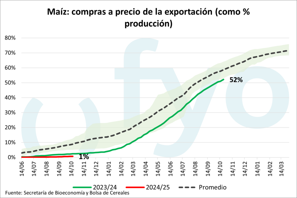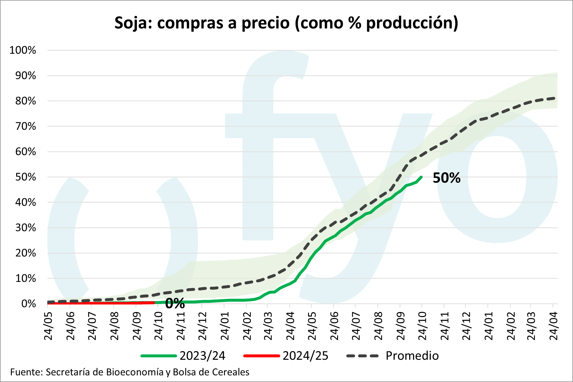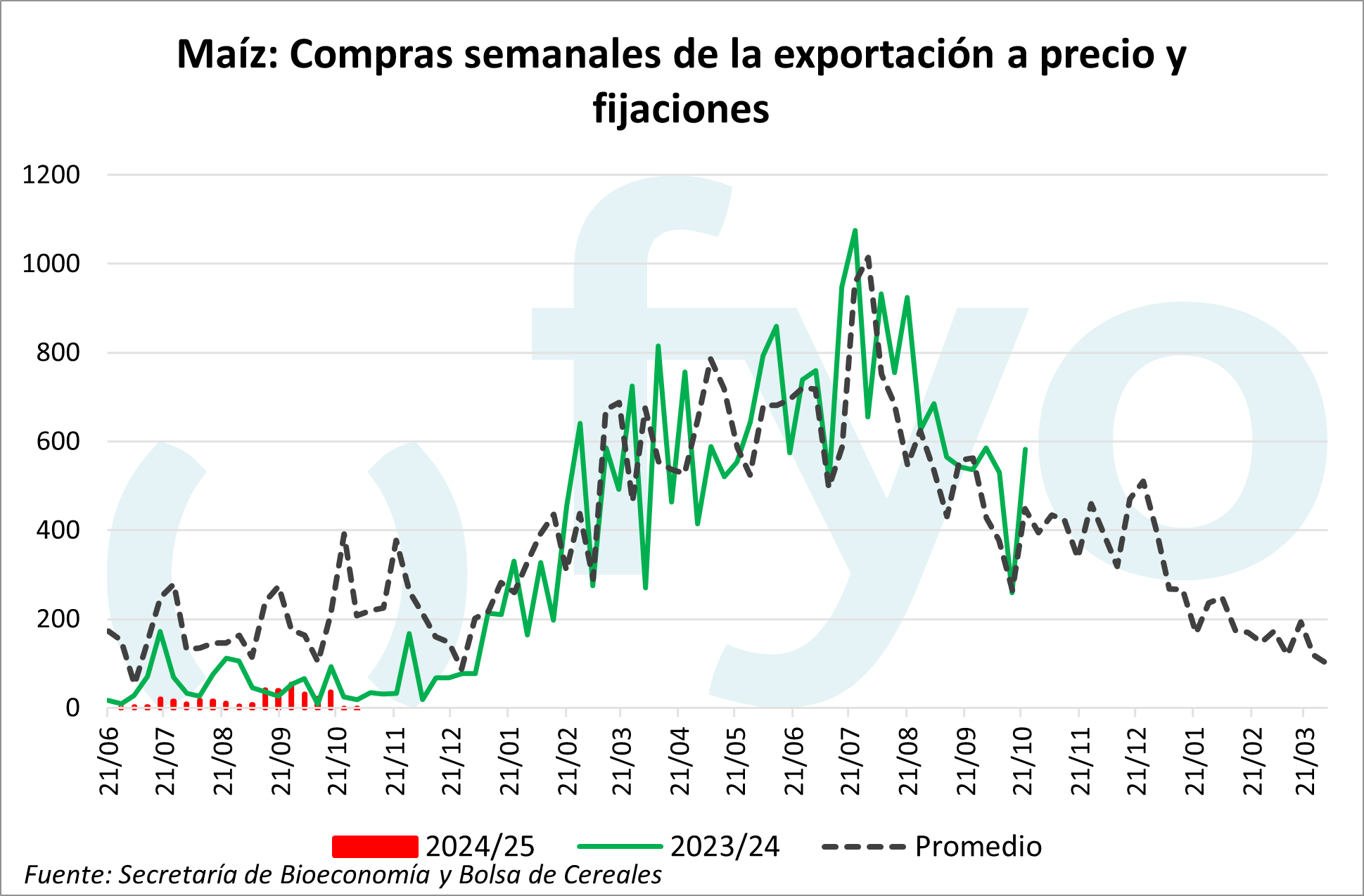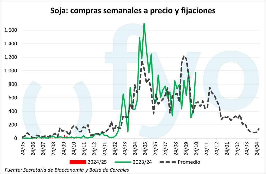 Para la semana finalizada el 23 de octubre, el pricing de la soja 2023/24 creció medio millón de toneladas, casi alcanzando el millón. De esta forma, la mitad de la producción ya tiene precio. El maíz disponible también tuvo un incremento en el ritmo de comercialización, ubicándose en 582.800 toneladas; aunque la originación de la nueva cosecha disminuyó, se situó en 75.000 toneladas, muy lejos de las casi 600.000 toneladas de hace tres semanas. En cuanto al trigo, las ventas a precio y a fijar se mantienen en torno a las 100.000 toneladas, tanto para la mercadería nueva como para la vieja.